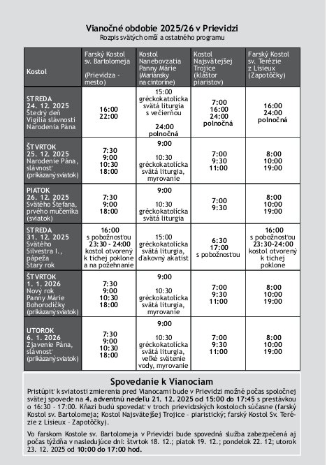 * V čase letných prázdnin ranné sv. omše PONDELOK až SOBOTU nebývajú (sv. omše označené *)